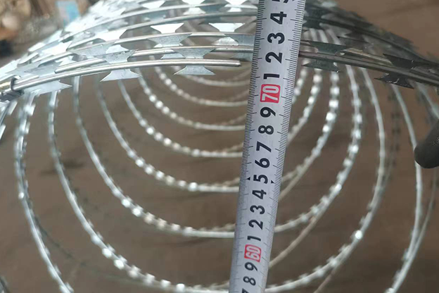O arame farpado está disponível em dois formatos (sem clipes e em formato concertina). No nosso arame concertina para venda, o diâmetro da bobina varia de 300 mm a 1200 mm. Os diâmetros mais pequenos têm geralmente três clipes por volta, enquanto os diâmetros maiores têm 5 a 7 clipes por volta. Todos os parâmetros podem ser personalizados de acordo com o pedido!